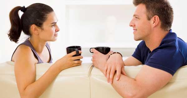 Sentados no sofá voltados um para o outro tentando perceber o que o destino lhes reserva .